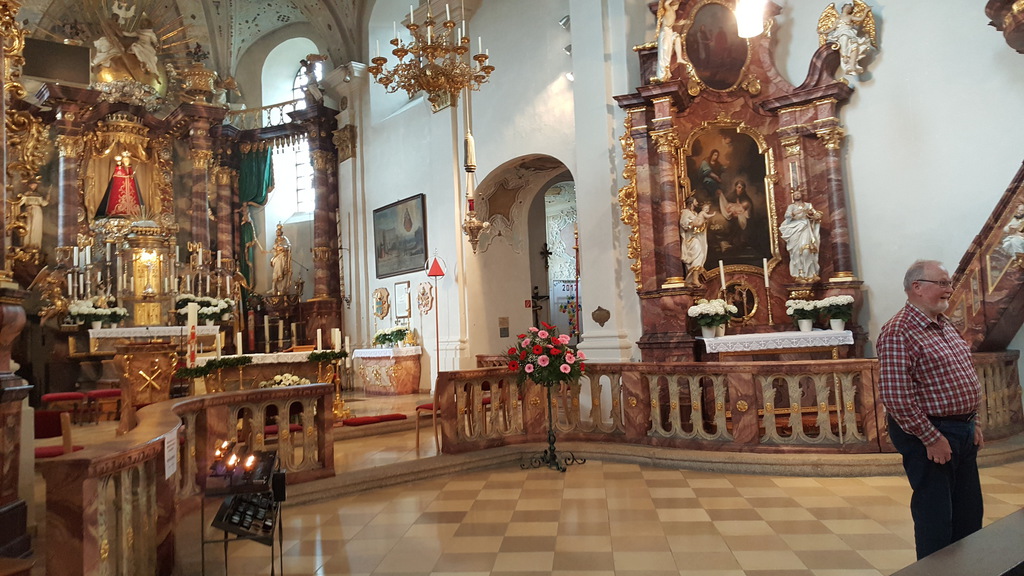 Zusammen wanderte man über Weickenreuth nach Marienweiher um die dortige Basilika zu besuchen. Herr Schmidt führte die Feuerwehrler in die Geschichte der Wallfahrtskirche und des Klosters ein. Dass seit vielen hundert Jahren die Franziskaner dort die Herrschaft haben, war den Wenigsten bekannt. Zum Kaffeetrinken ging es dann in die Gaststätte Rauh. Wer dann wollte konnte die Wegstrecke wieder zu Fuß zurücklegen, die Mehrzahl entschied sich aber mit den Feuerwehrfahrzeugen zurück nach Stammbach zu kommen.