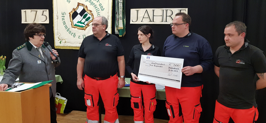 Anlässlich des Jubiläums überreichte die 1. Vorsitzende der BSG, Birgit Endress, zur Unterstützung der Stammbacher First Responder, einen Scheck über 500.--€.